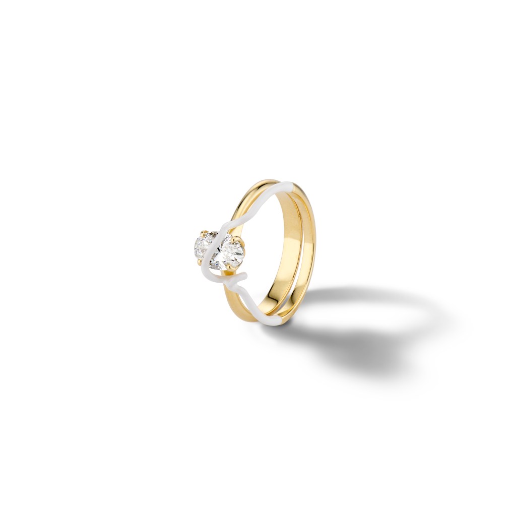 The message is that you can have a unique and a more classic ring all in one because they are actually two rings that stack together. One is an oval diamond solitaire with a 4 prong setting and the second ring works kind of like a ‘ring jacket’ adorning the first ring with a touch of white enamel giving it a whole new life. I liked the idea of creating something that could have this duality because I think that it reflects what someone could be looking for in an engagement rings.