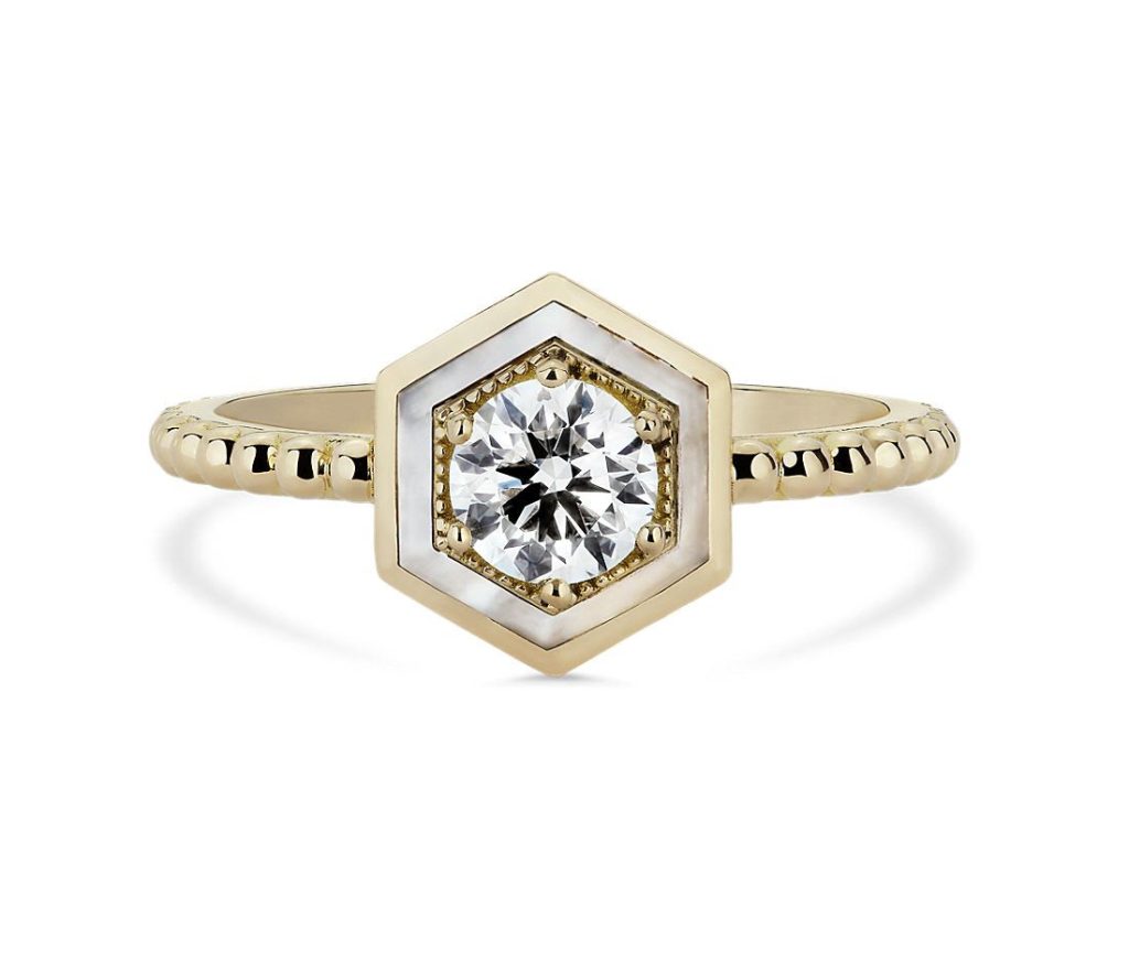 The inspiration for my design came from my own engagement ring, a round brilliant diamond that I had reset a few years ago in 18-karat yellow gold with a hexagonal halo and bead band. The mother of pearl halo on my design has a real connection to my own love story: I named this style the “Motu Ring” in reference to the reef around the lagoon that surrounds the island of Bora Bora, where my husband and I spent our honeymoon. This iridescent material is readily found in Bora Bora, and now surrounds a beautiful DeBeers diamond