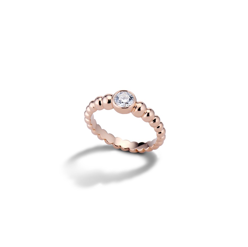For me, jewellery is story-telling. The Union tells the story of two individual lives coming together to form a union, a new journey. The rose gold beads in the band are continuous and unbroken, but not uniform. They graduate, peak with the diamond, then descend again. Each bead represents a milestone in the life of the betrothed couple. There’s a sense of balance and continuity to the design. The balance comes from the calibration between the warm pink gold that we chose for the setting and the pristine white solitaire diamond. The diamond is, of course, the focal point but it is exquisitely bezel-set and supported by the rich metal, another good union.