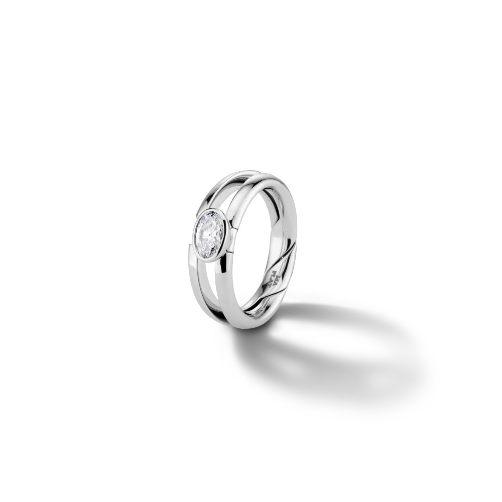 Dime means tell me in Spanish – but an intimate kind of “tell me” – like tell me something you wouldn’t tell anyone else in the world. That’s the name that I chose for our rings that have a special message. When DeBeers asked us to make a commitment ring with a center stone I jumped at the opportunity and the challenge of finding a home for a stone within this piece. We call it DiMe Siempre – tell me forever. I realized that I had to turn the piece entirely around and turn what we consider the closure on the piece into the mounting – like a jeweled evening bag. Then we really had some fun with how the piece would close and open into an infinity sign of course….so it’s the stone, the beautiful message that someone will write in it, the infinity sign upon opening and the fact that most of that is locked into someone’s ring…. a secret between two people.