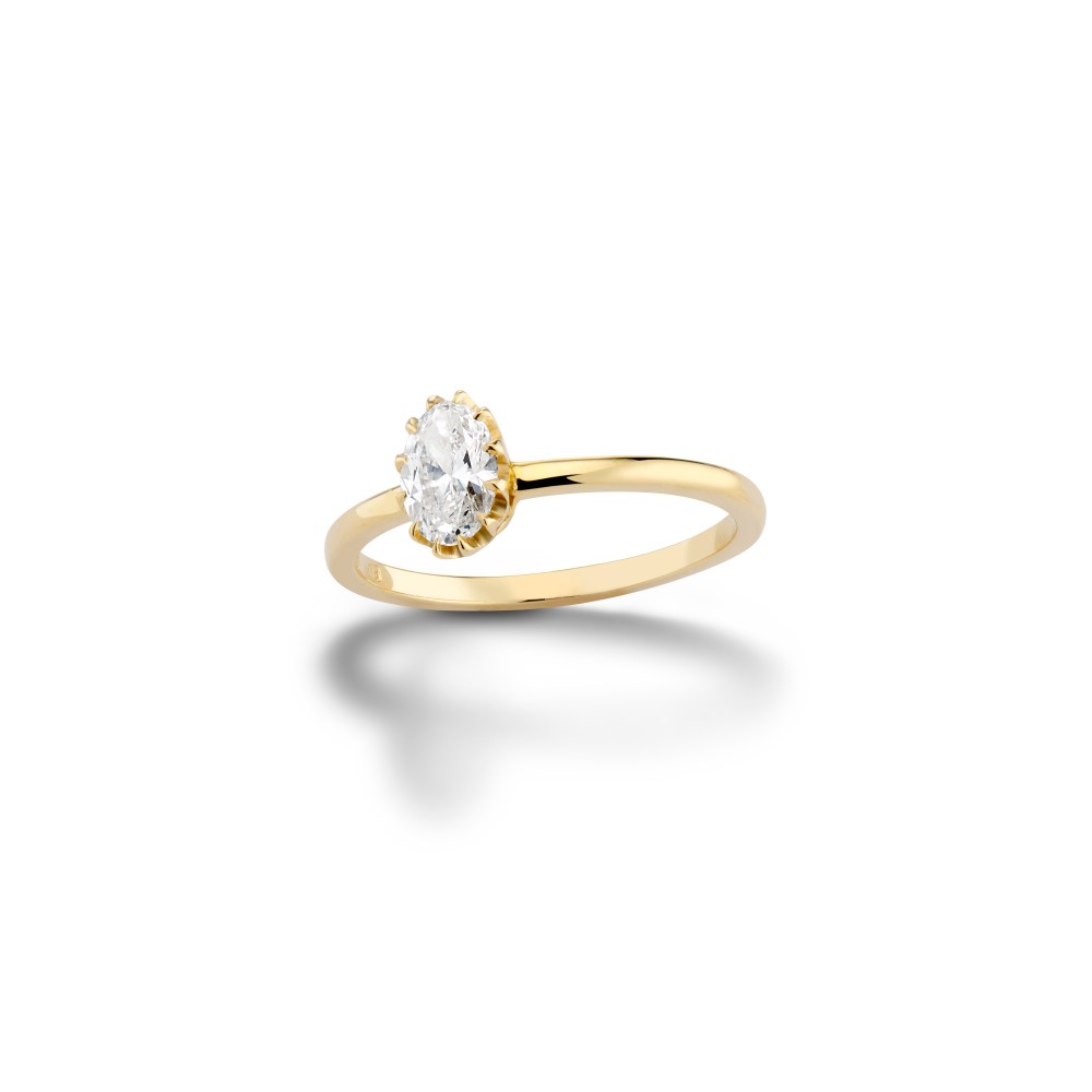 The crown ring is a mix of old and new the 12 prongs holding the diamond like a crown, amazing craftsmanship and the shank smooth, clean and modern. The ring has the the feel of a romantic feminine ring with a modern twist.