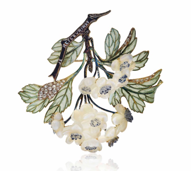 The brooch was by René Lalique, and represented a hawthorn twig with a text engraved: “Je Refleureray”. I will blossom again.