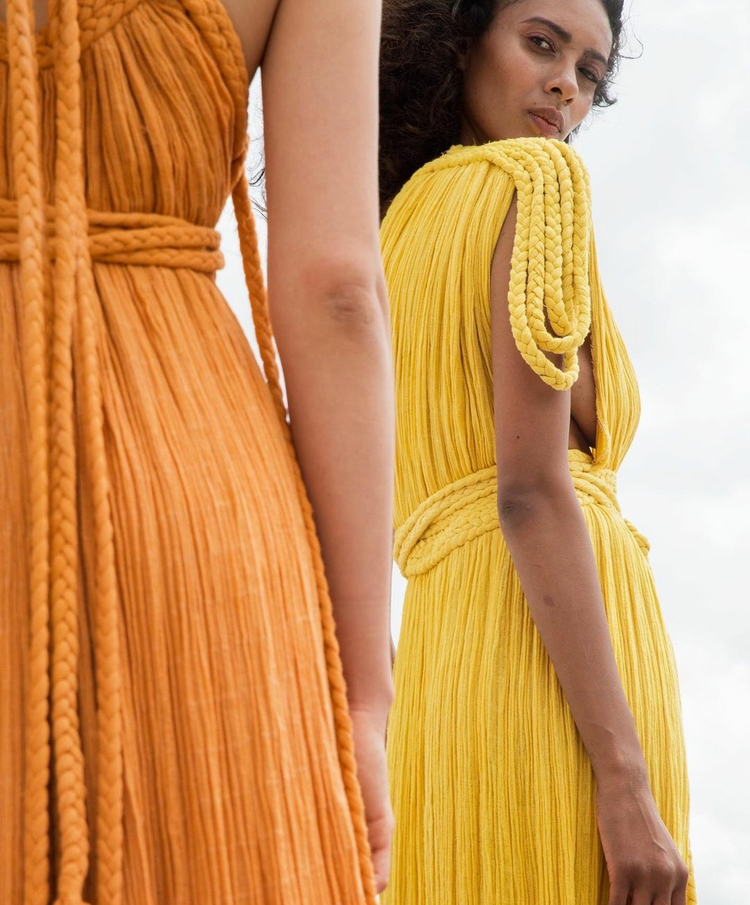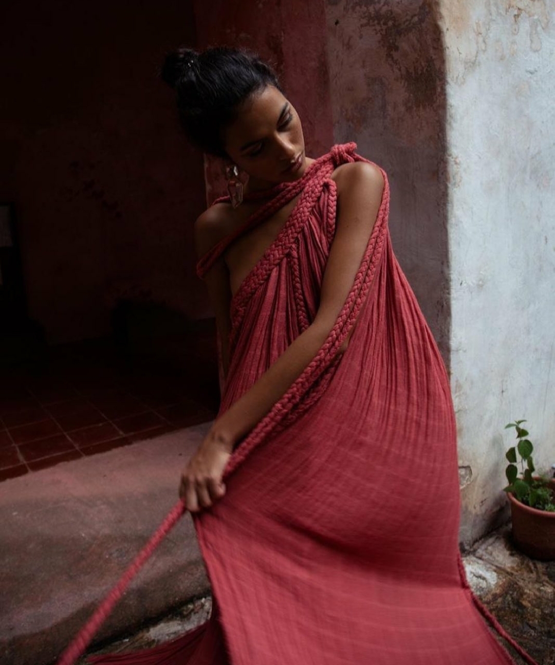 Kasia Kulenty dresses are made of airy cotton, cut, sewn, and braided by hand, and then individually dyed by local spiritual artisans.