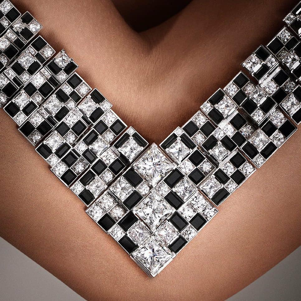 A hint of art-deco shows up in the Meride necklace set with diamonds, onyx, and rock crystal. It’s a complicated piece, which at the first glance seems just a normal two-dimensional necklace, but in fact, is a three-dimensional trompe-l’œil. The black and white color scheme recalls the roaring twenties when a combination of colorless diamonds and black onyx or lacquer was typical and often used by Cartier. By the way, the Maison started using onyx in the same period and turned it into one of its unmistakable milestones.
