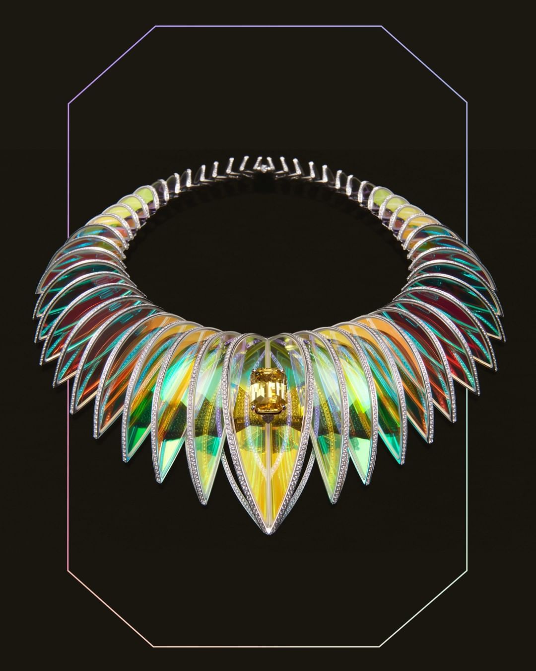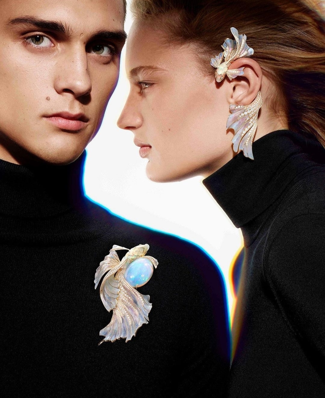 The essential piece of the collection is a Holographique necklace composed of coated rock crystal “petals”, each framed with a line of diamonds, with a 20.21 carat yellow octagonal Ceylon sapphire in the center. It’s the epitome of light in a jewelry piece. Alongside this almost futuristic Holographique series, a classic motif of flowers appeared with the same rainbow coating, which turned it into an ultramodern ornament. Another outstanding piece is the Opalescence single earring (or ear-sculpture) in the shape of a fish. It’s a big piece with a touch of Art Nouveau in its silhouette, and plique-à-jour technique used in fish fins. This type of enameling allowed the Maison to create very natural-looking transparency of the fins, which let the light shine through so the piece sparkles with holographic rays.
