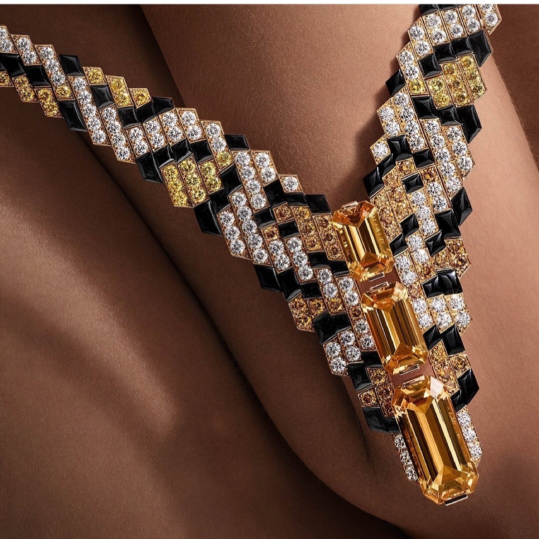 Also, these black and white spots make me think of the Panthere de Cartier, although there’s another piece responsible for this mental connection. The real ode to the Maisons’ mascot is the Pixelage necklace. It is set with three emerald-cut topazes as the axis of a step-shaped piece covered with colored diamonds and onyx. This necklace’s finish is so flat and even that it could well be on you as a second skin.