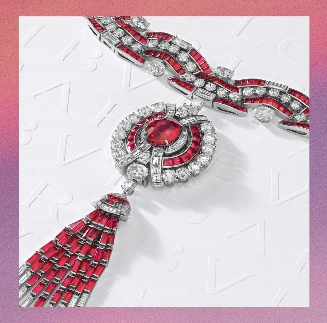 Of course, Bvlgari couldn’t leave the Serpenti apart. My favorite representation of the iconic design in Magnifica is an achromatic neckpiece with a dynamic jabot line. This piece can be worn in two modifications – as a choker or “stretched” to curl on the collarbones. There is another piece that can be worn in 9 different ways – the vibrant Metamorphosis necklace set with diamonds and rubies with a detachable tassel. This neckpiece also has a matching watch.