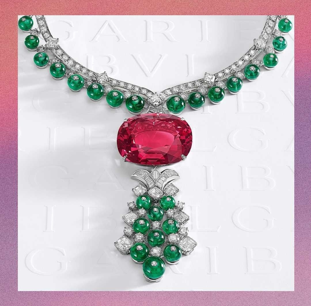 Magnifica conveys this message through important colored stones and strong designs. Take the Mediterranean Queen necklace with 5 Paraiba tourmalines of a total of around 500 carats, or the necklace Imperial Spinel set with an impressive spinel, the 4th biggest in the world, surrounded by a cascade of diamonds and emerald beads.