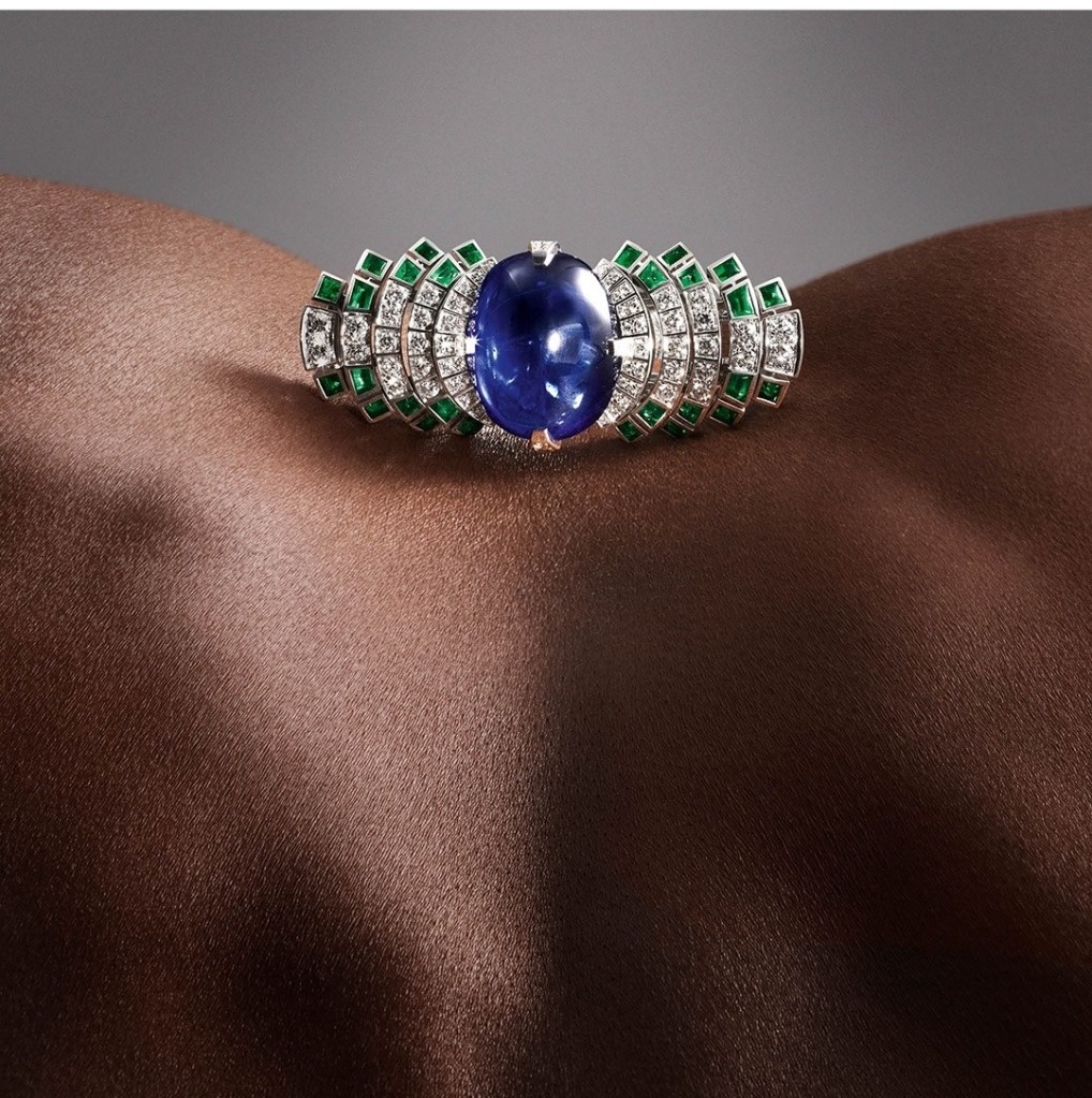 What catches the eye at first and makes one think of the 1920s’ is the Parhelia ring/brooch with the central 20.51-carat cabochon sapphire and dispersing to both sides like echo waves, lines of diamonds and emeralds. The peacock color combination, together with the composition, the silhouette, and the proportions of the piece reminds me of the scarab-pins from the art deco period.